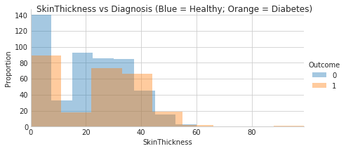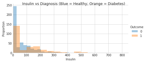 When starting a new data analysis project it is important to inspect, understand, and clean the data. When inspecting the first ten rows of data one thing that jumps out right away is that there are measurements of zero for both insulin levels and skin thickness.